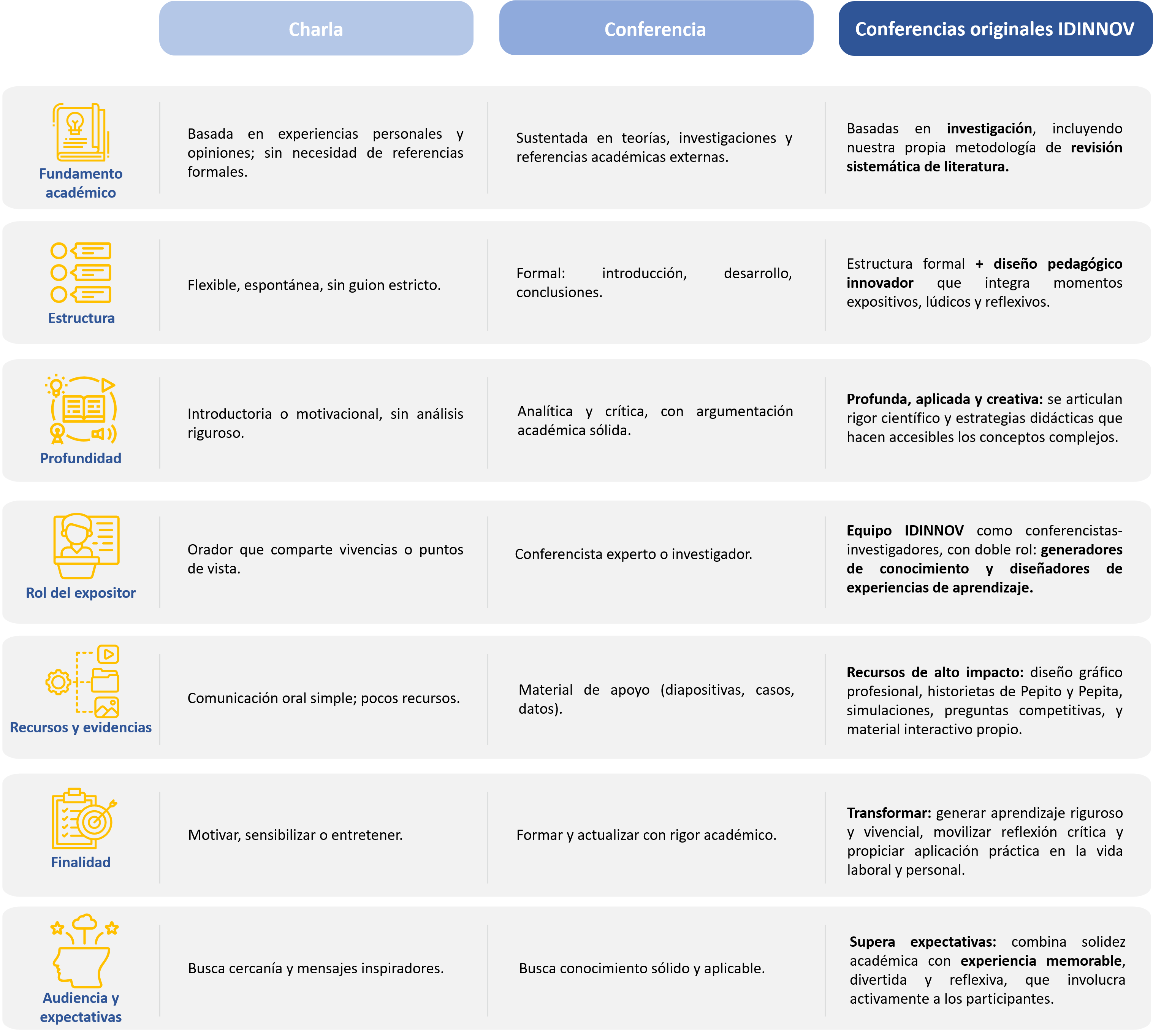 Para evidenciar su propuesta única, se presenta la comparación entre charlas, conferencias tradicionales y las Conferencias Originales IDINNOV:
